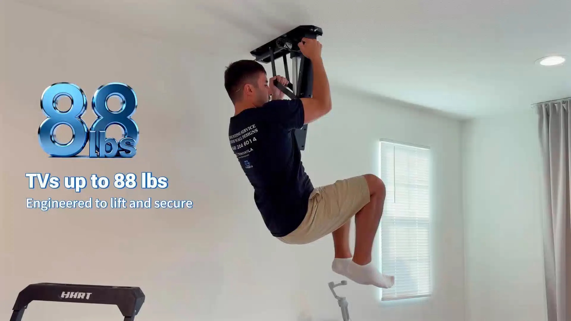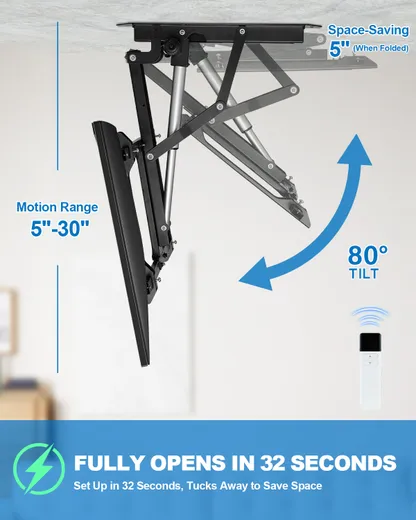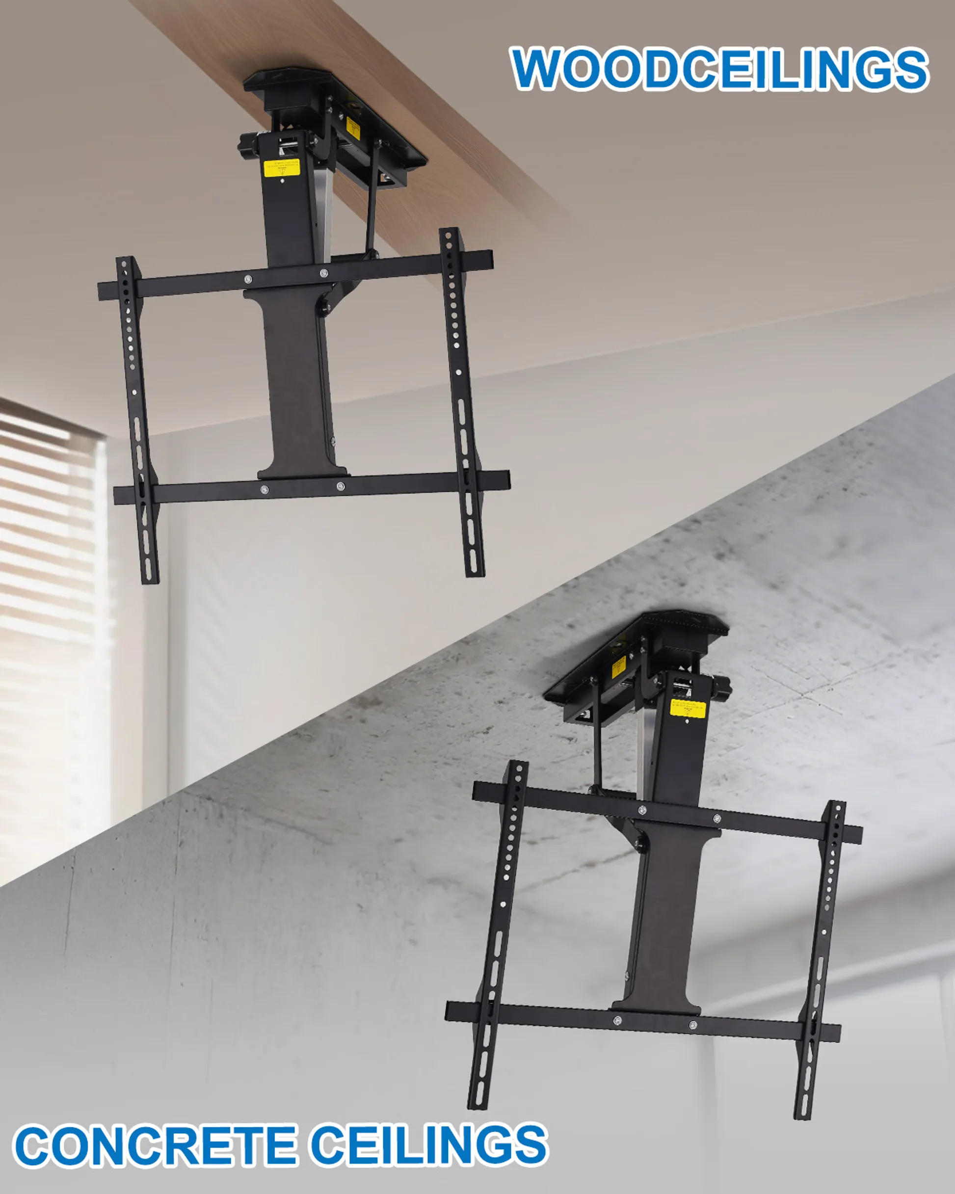 • Space-Saving Design: By mounting your TV on the ceiling and fold it when it’s not in use , you can save valuable floor and wall space, creating a clean and uncluttered look in your living area. And the mount works seamlessly on both flat and pitched ceilings.