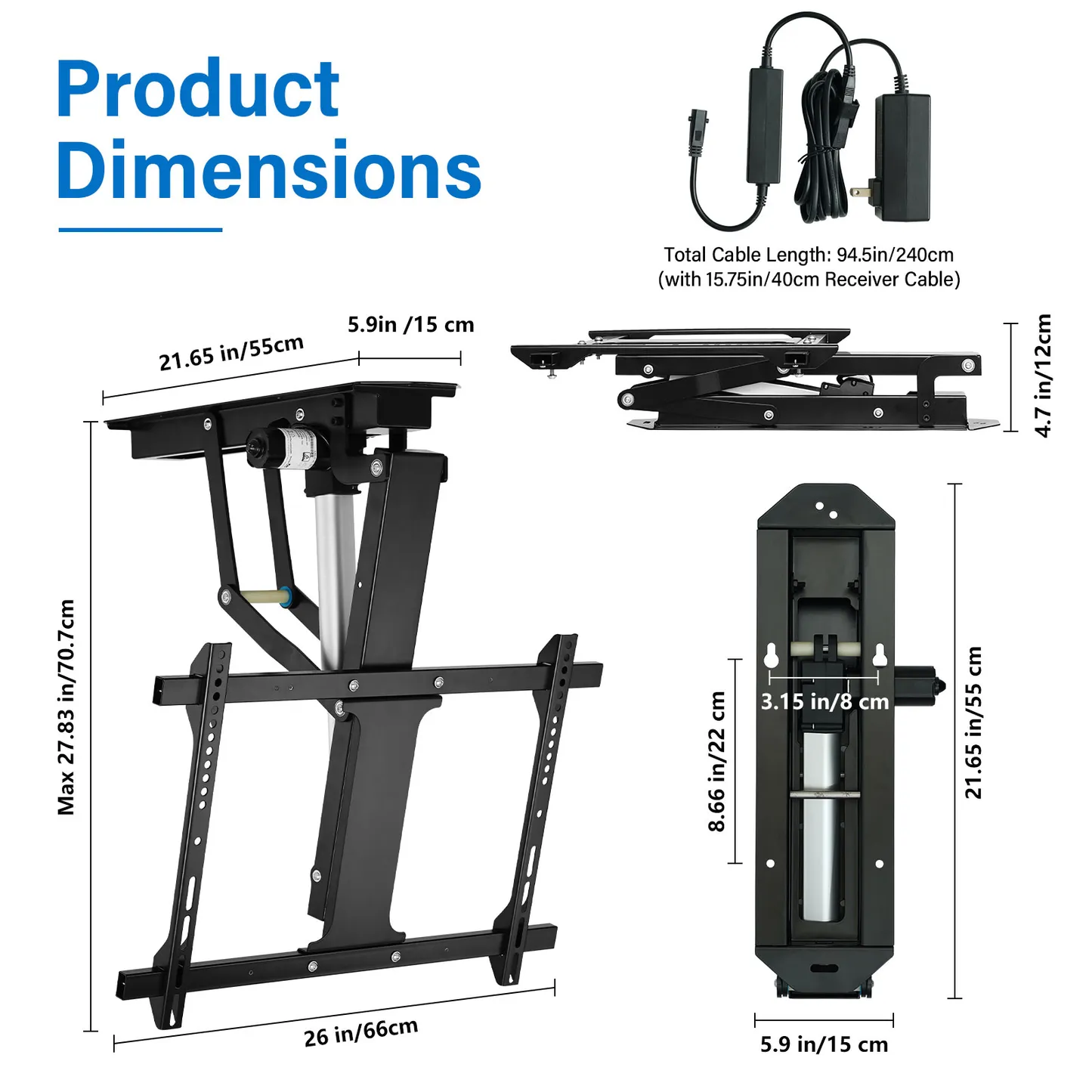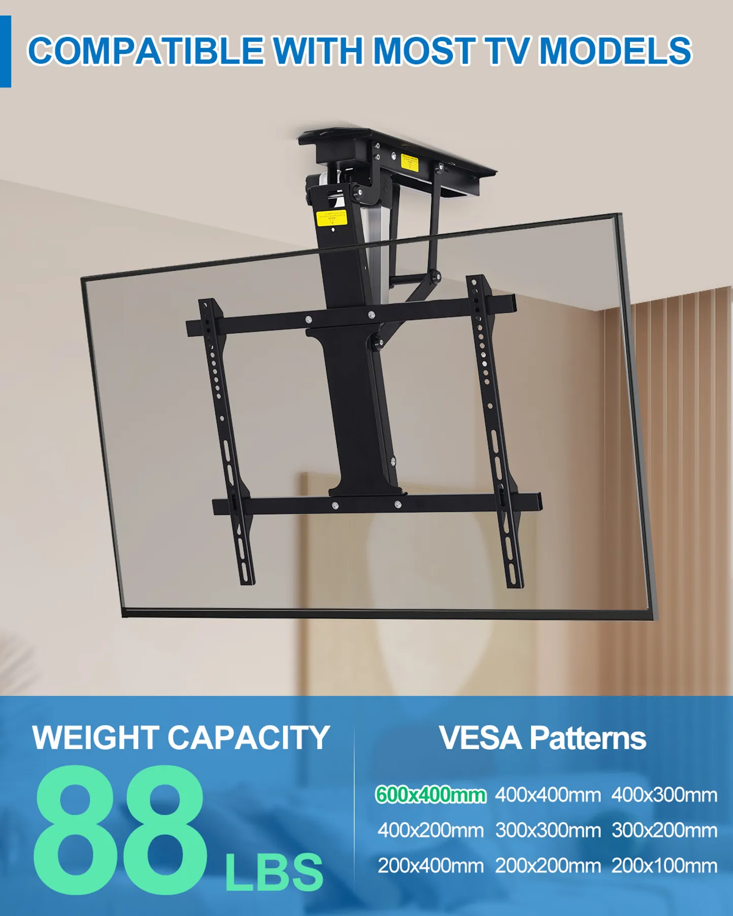 • Electric Adjustment: The powerful motor enables you to raise or lower the TV's position with ease, supporting a weight capacity of 88lbs, all controlled by the remote control within a range of 98 ft/30m. It is useful for optimizing the TV's height based on different activities or scenes.
